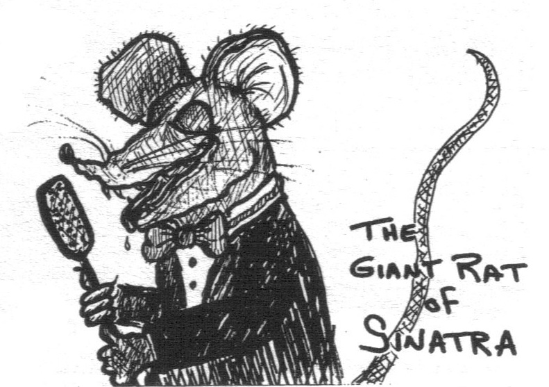 that there is no Sherlockian group called "The Giant Rats of Sinatra" in his annals, but recalls that back in 1991 British Sherlockian Roger Johnson asked, "What is huge and furry, has vicious fangs, big ears and a long tail, and sings 'My Way'?" Of course the answer is "The Giant Rat of Sinatra." Roger not only remembers the joke, but adds that his wife Jean Upton memorialized it in a delightful drawing which she's kindly shared with us.